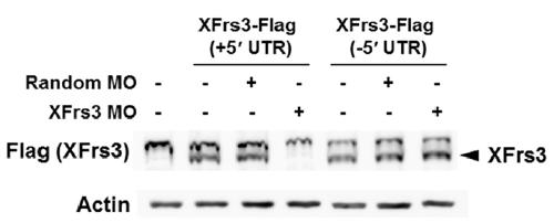 Supplement Fig. 6. Specificity of XFrs3 MO. 2-cell embryos were injected to equatorial region with indicated combinations of XFrs3-Flag mRNA with (+5' UTR) or without (-5' UTR) XFrs3 5' UTR (50 pg/embryo), and random or XFrs3 MO (7.5 pmole/embryo). Embryos were harvested at stage 10, and the expression levels of XFrs3-Flag are compared by anti-Flag immunoblotting [Flag (XFrs3)]. XFrs3 MO specifically inhibited the translation of XFrs3-Flag from mRNA containing the 5'UTR. Actin is used as a loading control. |