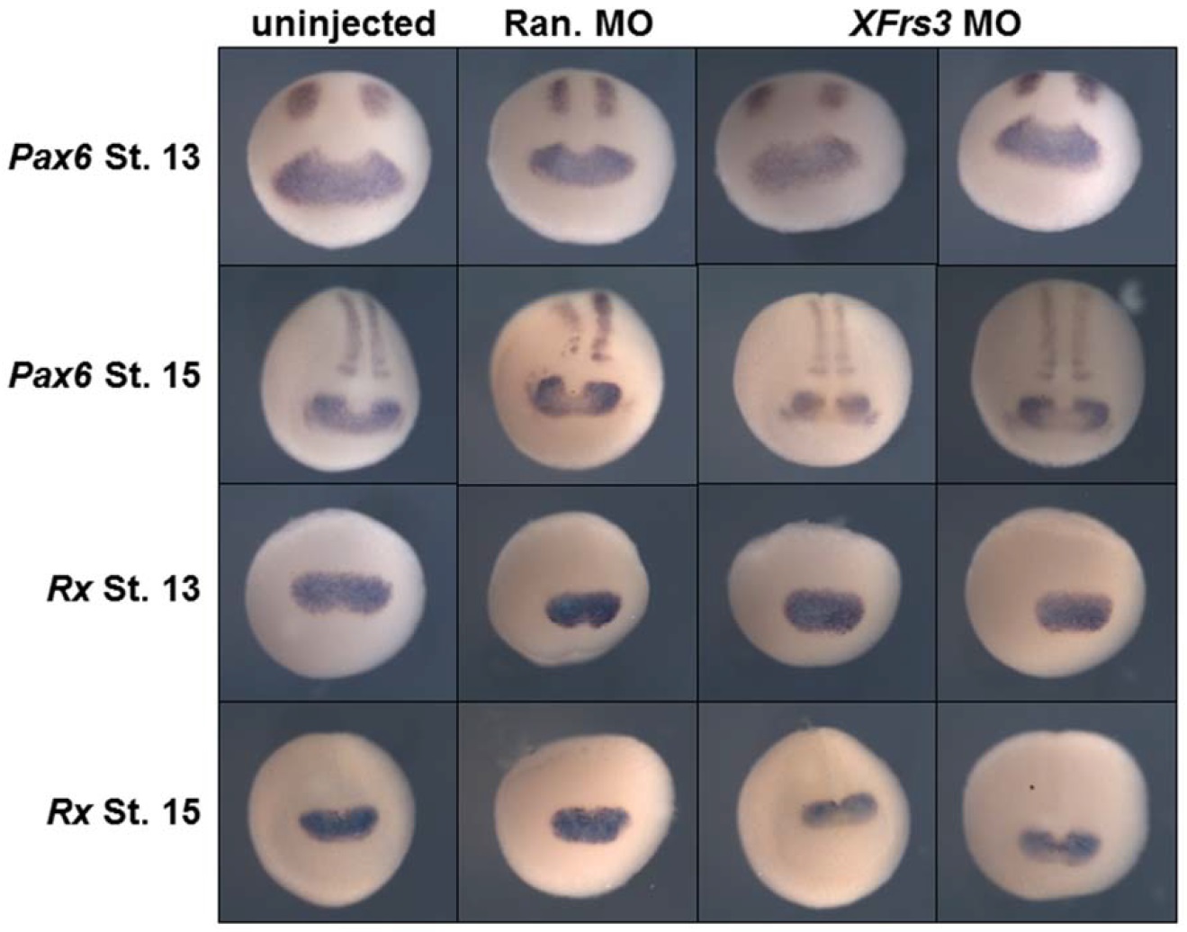 Supplement Fig. 8. XFrs3 Mo does not affect the initial expression of eye markers Pax6 and Rx. XFrs3 or random (Ran.) control MO (7.5 pmole each/embryo) was injected to equatorial region of 2-cell embryos, and embryos are analyzed by in situ hybridization for Pax6 and Rx at indicated stages (St. 13 and 15). |