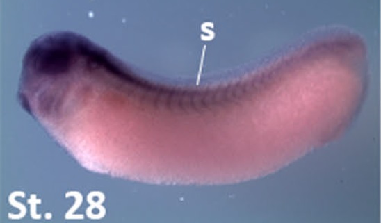 frs3 (fibroblast growth factor receptor substrate 3) gene expression in Xenopus laevis embryo, assayed via in situ hybridization, NF stage 28, lateral view, anterior left, dorsal up. |