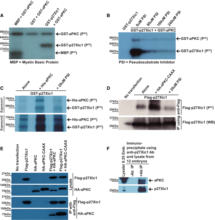 Figure 3. aPKC Directly Phosphorylates p27Xic1(A) In vitro kinase assays showing that aPKC phosphorylates bacterially expressed GST-p27Xic1. Myelin basic protein (MBP) was used as a positive marker for aPKC phosphorylation.(B) Specificity of the kinase reaction was confirmed by using a pseudosubstrate inhibitor of aPKC.(C) Kinase assay performed in an embryonic environment (using embryo lysate instead of kinase buffer) also confirmed p27Xic1 being a direct phosphorylation target of aPKC.(D) In vivo kinase assay shows that p27Xic1 incorporates higher amount of P32 when it is co-overexpressed along with aPKC-CAAX; the amount of incorporated P32 is lower when p27Xic1 in overexpressed in HeLa cells in the presence of pseudosubstrate inhibitor against aPKC.(E) CoIP of HA-aPKC-CAAX with Flag-p27Xic1 in HeLa cells shows that aPKC-CAAX and p27Xic1 interact physically.(F) Physical interaction between p27Xic1 and aPKC was confirmed for endogenous proteins from embryonic lysates by a coIP assay using antibodies against endogenous p27Xic1 and aPKC. See also Figures S2 and S3. |