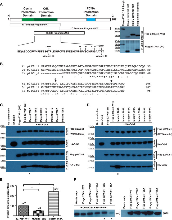 Figure 4. aPKC Phosphorylates p27Xic1 in Its Cdk-Interaction Domain, Leading to Its Weaker Binding and Inhibition of Cdk2(A) The schematic shows p27Xic1 protein with its key interaction domains. Boxes in the middle show N-terminal, C-terminal and middle fragments that were used for immunocomplex kinase assays that indicated that aPKC phosphorylates p27Xic1 in its N-terminal half of the protein. The amino acid sequence underneath represents the Cdk-interaction domain of p27Xic1. MS analysis of Flag-p27Xic1 post-kinase assays identified multiple phosphorylation sites within its Cdk interaction domain with significant confidence scores (Ascores ⥠13) after aPKC phosphorylation of p27Xic1 in vitro (indicated by arrows), whereas phosphosite (T68) was picked with Ascore of 27 after in vivo kinase assay; another phosphosite (T99) was picked with Ascore of 13 (both indicated by asterisks).(B) Sequence alignment of the N-terminal half of Xenopus p27Xic1 with other CIP/KIP CdkIs shows that aPKC phosphosite T68 (with arrow) in p27Xic1 is conserved in mammalian p21Cip1 and fish p27Xic1; site T99 (with arrowhead) shows no conservation. Asterisks indicate fully conserved residues, whereas colons and periods indicate groups with strongly and weekly similar properties, respectively.(CâE) In coIP assays performed in HeLa cells, phosphomimetic mutant for the site (T68E) showed reduced binding against Cdk2, whereas phosphomutant for the same site (T68A) showed enhanced binding against Cdk2. See also Figure S5. Quantitation for binding of wild-type and mutants p27Xic1 is shown in (E) (mean ± SEM).(F) Histone H1 kinase assay shows that phosphomutant T68A of p27Xic1 strongly inhibits Cdk2âs kinase activity, whereas phosphomimetic p27Xic1 (T68E) had negligible effect on the kinase activity of Cdk2, in comparison to the wild-type and T99 mutants of p27Xic1. Left blot shows the autoradiogram while the right blot shows the corresponding IP/western blot control. See also Figure S4. |