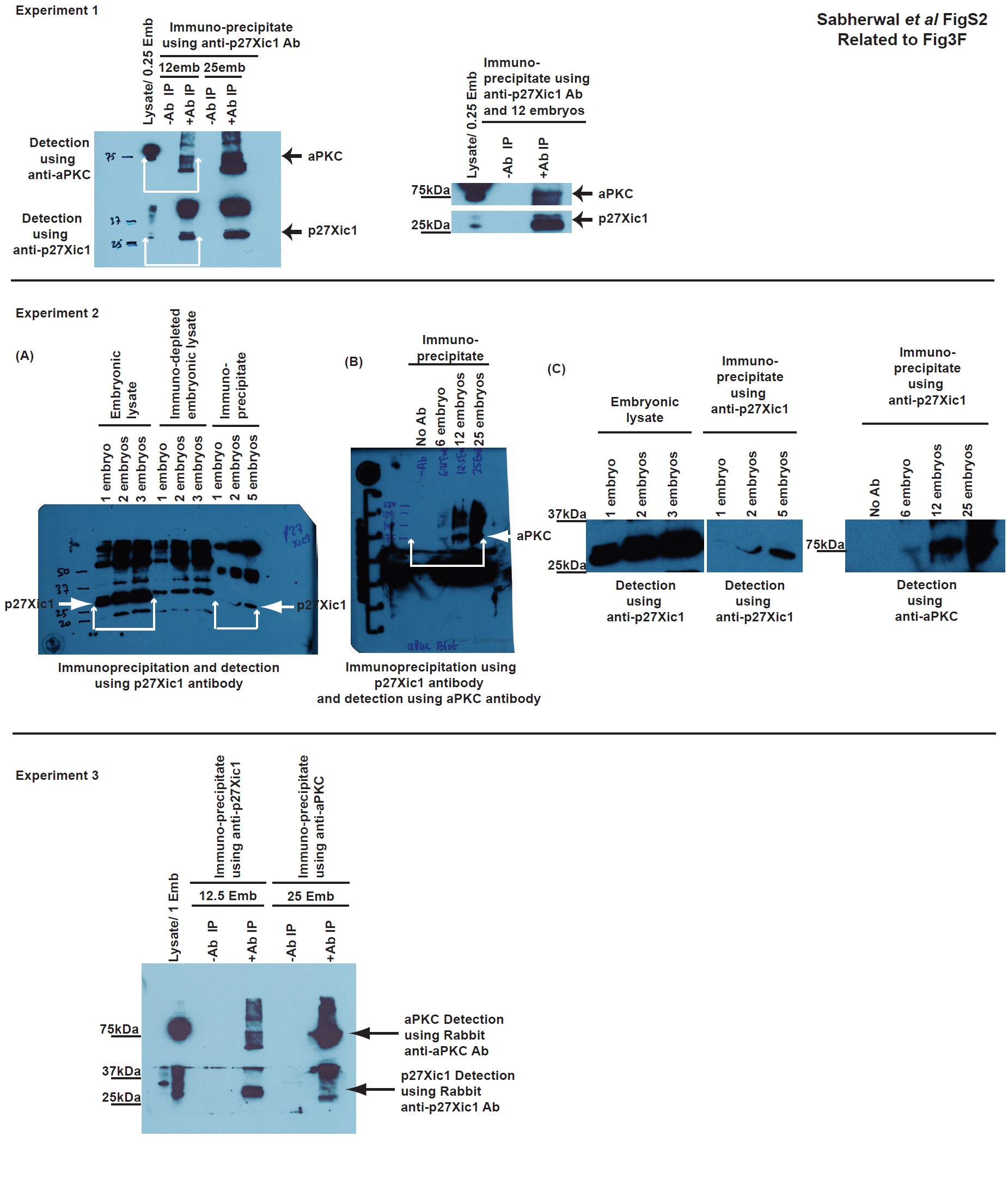 FigS2, related to fig3F: Physical interaction between p27Xic1 and aPKC was confirmed for endogenous proteins from embryonic lysates by a co-immuno-precipitation assay using antibodies against endogenous p27Xic1 and aPKC. In the first two experiments and last experiment (lanes 2 and 3), p27Xic1 was immuno-precipitated from embryonic lysate usinga home-made antibody against p27Xic1 and aPKC bound to p27Xic1 was detected using a commercially available aPKC antibody. Original blots for first two experiments are shown on the left hand side and the final blots are shown on right hand side. Final blot from the experiment 1 has been shown in fig3F. The last two lanes in experiment 3 show the inverse experiment where aPKC was immunoprecipitated using antibody against aPKC and p27Xic1 bound to it was detected using home-made antibody against p27Xic1. |