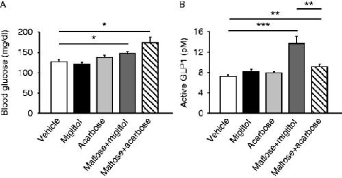 Figure 3. Comparison between miglitol and acarbose of GLP1 secretion induced by maltose. Blood glucose (A) and plasma GLP1 concentrations (B) in the portal vein at 30 min after oral administration of miglitol, acarbose, maltose plus miglitol, or maltose plus acarbose are shown. Data are expressed as mean±s.e.m. *P<0.05, **P<0.01 and ***P<0.001.