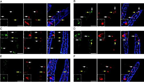 Figure 5. Activation of CaMK2 of duodenal enteroendocrine cells. (A, B, C, D, and E) Immunohistochemistry of phospho-CaMK2 (green) and 5-HT (red) of duodenum is shown. (A) Oral vehicle administration. (B) Intraduodenal glucose administration. (C) Oral maltose plus miglitol administration. (D) Oral miglitol administration. (E) Oral acarbose administration. (F) Intraperitoneal glucose administration. Insets denote the cells indicated by yellow arrows at a higher magnification. White arrows indicate immunopositive cells. (A, B, C, D, and E) Images of phospho-CaMK2 (left), 5-HT (middle), and their superposition (phospho-CaMK2, 5-HT, and DAPI). Bars indicate 50 μm.