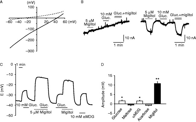 Figure 4. Electrophysiological recording of Xenopus laevis oocytes expressing hSGLT3. (A, B, C, and D) (A) I–V relationship of the oocytes expressing hSGLT3 in the presence (solid line) or absence (dashed line) of miglitol. (B) A representative recording of whole-cell current under voltage clamp mode in an oocyte expressing hSGLT3 in the absence (left) or presence (right) of Na+ in the buffer. ‘Gluc.’ denotes glucose. (C) A representative recording of the membrane potentials under current clamp mode in an oocyte expressing hSGLT3 in response to glucose and/or miglitol. The SGLT3 agonist α-methyl-d-glucopyranoside (αMDG) was used as a positive control for SGLT3-dependent depolarization. ‘Gluc.’ denotes glucose. (E) The current changes by several stimuli (n=4 for each). Data are expressed as mean±s.e.m. *P<0.05 and **P<0.01 (compared with the base line).