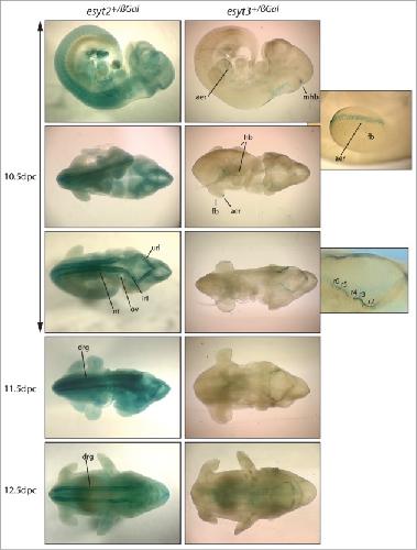 Figure 3. Expression pattern of the esyt2 and −3 genes in early mouse embryos. Expression was determined by conversion of X-Gal (blue-green) by ß-galactosidase produced from the gene inserted into the esyt2 and esyt3 gene loci. Enlarged panels on the right show a limb-bud and the hindbrain region of esyt3+/ß−Gal embryos. “aer” apical ectodermal ridge, “mhb” midbrain-hindbrain boundary, “fb” forelimb bud, “hb” hindlimb bud, “url” and “lrl” upper and lower rhombomere lips, “r2-6” rhombomeres, “ov” otic vesicle, “nt” neural tube, “drg” dorsal root ganglion.