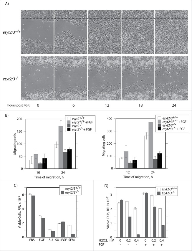 The Extended Synaptotagmins (Esyts) are a family of multi-C2 domain membrane proteins with orthologs in organisms from yeast to human. Three Esyt genes exist in mouse and human and these have most recently been implicated in the formation of junctions between endoplasmic reticulum and plasma membrane, as well as the Ca(2+) dependent replenishment of membrane phospholipids. The data are consistent with a function in extracellular signal transduction and cell adhesion, and indeed Esyt2 was previously implicated in both these functions in Xenopus. Despite this, little is known of the function of the Esyts in vivo. We have generated mouse lines carrying homozygous deletions in one or both of the genes encoding the highly homologous Esyt2 and Esyt3 proteins. Surprisingly, esyt2(-/-)/esyt3(-/-) mice develop normally and are both viable and fertile. In contrast, esyt2(-/-)/esyt3(-/-) mouse embryonic fibroblasts display a reduced ability to migrate in standard in vitro assays, and are less resistant to stringent culture conditions and to oxidative stress than equivalent wild type fibroblasts.