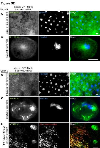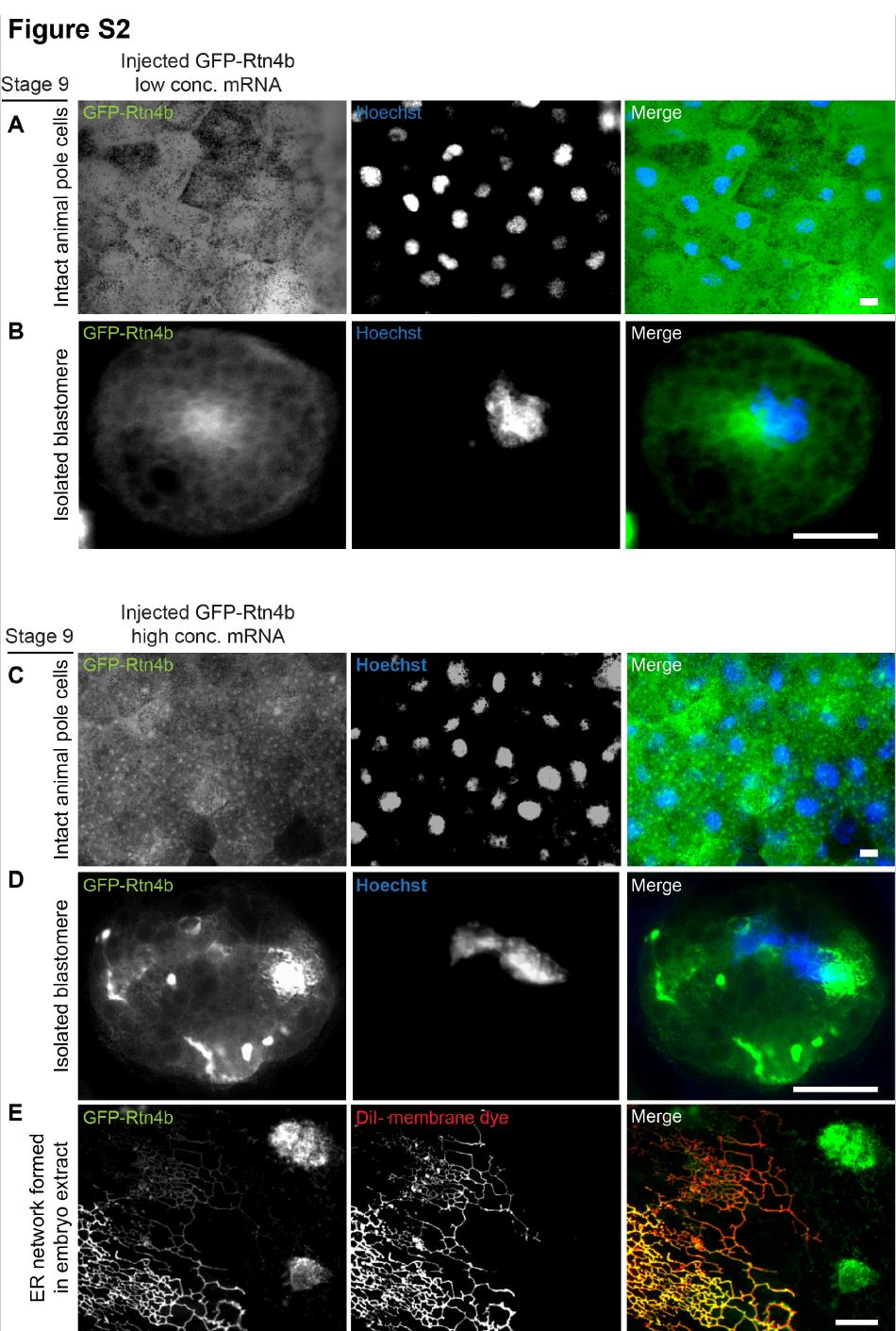 Figure S2, Related to Figure 2. High expression levels of GFP-Rtn4b cause Rtn4 aggregation Ectopic expression of GFP-Rtn4a and GFP-Rtn4b at lower concentrations decreased nuclear size as expected [S1] (Figure 2A-B, S1F-G). High expression levels of GFPRtn4b led to the formation of reticulon aggregates that we hypothesize have a dominant negative effect on ER structure resulting in a concomitant increase in nuclear size (Figure 2A-B, S1G). Studies with mammalian, yeast, and Arabidopsis reticulons support the idea that overexpressed reticulons aggregate and disrupt normal ER structure [S2- S4]. (A,B) One-cell embryos were microinjected with the low concentration of GFP-Rtn4b mRNA and allowed to develop to stage 9. (A) Nuclei were stained with Hoechst and the animal pole in an intact embryo was visualized by confocal microscopy. No Rtn4b bright foci are apparent. Scale bar, 20 μm. (B) Embryos were transferred to calcium/magnesium-free medium. Isolated blastomeres were fixed, stained with Hoechst, and visualized by confocal microscopy. No Rtn4b bright foci are apparent. Scale bar, 20 μm. (C-E) One-cell embryos were microinjected with the high concentration of GFP-Rtn4b mRNA and allowed to develop to stage 9. (C) Nuclei were stained with Hoechst and the animal pole in an intact embryo was visualized by confocal microscopy. Bright Rtn4b foci are visible. Scale bar, 20 μm. (D) Embryos were transferred to calcium/magnesium-free medium. Isolated blastomeres were fixed, stained with Hoechst, and visualized by confocal microscopy. Bright Rtn4b foci are visible. Scale bar, 20 μm. (E) Embryo extract was prepared as described previously [S5]. Extract was incubated for 45min at 21°C, and ER networks were visualized with CM-DiI membrane dye. The images show colocalization of GFP-Rtn4b with the tubular ER network as well as aggregates of GFP-Rtn4b not associated with membrane. Scale bar, 20 μm. |