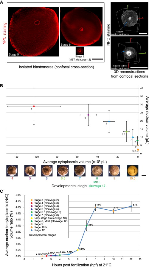 Figure 1. Nuclear and Cell Volumes Scale Smaller during Xenopus Early Development, with the N/C Volume Ratio Increasing prior to the MBT(A) X. laevis embryos that were unarrested (i.e., not treated with cycloheximide) were cultured from stage 2 in calcium/magnesium-free medium within intact vitelline membranes. At desired stages, dissociated blastomeres were immediately fixed and subjected to whole-mount fluorescence immunocytochemistry staining with mAb414, an antibody against the nuclear pore complex (NPC). Nuclei within intact, roughly spherical blastomeres were visualized by confocal microscopy. Cross-sectional area was quantified for both cells and nuclei ( Figures S1A and S1B). The right side of the panel shows representative 3D reconstructions from cell and nuclear confocal sections. Image acquisition and quantification are detailed in Supplemental Experimental Procedures. Direct volume measurements agreed within 9% and 3% of volumes extrapolated from cross-sectional areas for stage 6 and stage 8 (MBT, cleavage 12), respectively, validating our approach of estimating volumes from cross-sectional area measurements. All scale bars represent 50 μm.(B) Nuclear and cell volumes were extrapolated from cross-sectional area measurements (Figures S1A and S1B). Cytoplasmic volume was determined by subtracting nuclear volume from cell volume. Average values are plotted, and error bars represent SD. The scale bar represents 500 μm.(C) Average nuclear-to-cytoplasmic (N/C) volume ratios are plotted as a function of time postfertilization, and error bars are SE.See also Figure S1. |