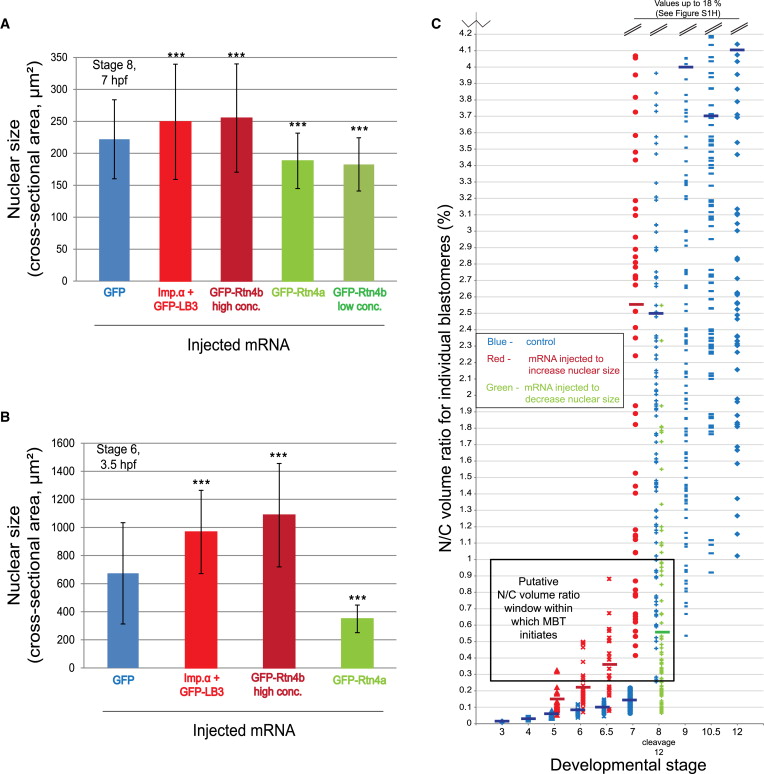 Figure 2. Manipulating Nuclear Size and the N/C Volume Ratio in X. laevis Embryos(A) One-cell embryos were microinjected with the most effective amounts of indicated mRNAs: GFP, 100 pg; Imp.α + GFP-LB3, 1,000 pg; GFP-Rtn4b high concentration, 500 pg; GFP-Rtn4a, 350 pg; and GFP-Rtn4b low concentration, 150 pg. Nuclei were isolated from stage 8 embryos and visualized by immunofluorescence using mAb414. Nuclear cross-sectional area was quantified for at least 500 nuclei from â¼100 embryos for each condition. One representative experiment of three is shown; error bars represent SD; âââp < 0.001.(B) Embryos were injected as described in (A). Nuclei were visualized in isolated stage 6 (3.5 hpf) blastomeres by whole-mount immunocytochemistry as described in Figure 1A. Nuclear cross-sectional area was quantified for at least 50 nuclei for each condition. One representative experiment of two is shown; error bars represent SD; âââp < 0.001.(C) Embryos were injected as described in (A). Nuclei were visualized in isolated blastomeres at the indicated stages by whole-mount immunocytochemistry, and N/C volume ratios were quantified as in Figure 1. N/C volume ratios for individual blastomeres are plotted. N/C ratios shown in blue represent control blastomeres and were calculated from the data shown in Figures S1A and S1B. For stages 7â12, N/C ratios greater than 4.2% were excluded for clarity, and all of those data are plotted in Figure S1H. N/C ratios shown in red represent blastomeres with increased nuclear size (i.e., injected with importin α + GFP-LB3 or GFP-Rtn4b high concentration). N/C ratios shown in green represent blastomeres with decreased nuclear size (i.e., injected with GFP-Rtn4a or GFP-Rtn4b low concentration). Stage 5 blastomeres with increased nuclear size: n = 28; stage 6 blastomeres with increased nuclear size: n = 38; stage 6.5 blastomeres with increased nuclear size: n = 23; stage 7 blastomeres with increased nuclear size: n = 55; stage 8 blastomeres with decreased nuclear size: n = 83. Short, thick horizontal lines indicate mean values for each stage. The box labeled âputative N/C volume ratio window within which MBT initiatesâ denotes the overlap between wild-type stage 8 blastomeres with the smallest N/C volume ratios and stage 5â6.5 blastomeres with increased nuclear size.See also Figure S2. |