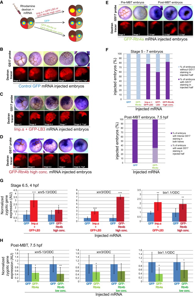 Figure 3. Altering the N/C Volume Ratio Changes the Timing of the Onset of Zygotic Transcription(A) The experimental scheme is depicted in which one blastomere of a two-cell embryo is coinjected with rhodamine-labeled dextran and mRNA to alter nuclear size in half of the embryo.(BâE) Embryos at the indicated stages and microinjected with the indicated mRNAs were subjected to in situ hybridization to detect the GS17 transcript. The top panels are bright-field images of embryos stained for GS17 (purple). The bottom panels are the corresponding rhodamine fluorescence images indicating cells in the embryo that received the indicated mRNA. Representative embryos are shown.(F) The top graph shows the percentage of stage 5â7 embryos in which the injected half showed GS17 staining whereas the uninjected half did not (dark purple bars). GFP: n = 57; GFP-Rtn4a: n = 42; Imp.α + GFP-LB3: n = 119; GFP-LB3: n = 124; GFP-Rtn4b high conc.: n = 139. The bottom graph shows the percentage of post-MBT (7.5 hpf) embryos in which the injected half showed weak GS17 staining relative to the uninjected half (light purple bar). GFP: n = 38; GFP-Rtn4a: n = 70.(G and H) One-cell embryos were microinjected with the indicated mRNAs to increase (G) or decrease (H) nuclear size and allowed to develop to stage 6.5 (G) or post-MBT 7.5 hpf (H). Total RNA was isolated from 12 embryos for each condition and converted to cDNA. Expression levels of three zygotic genes (xnr5-13, xnr3, and bix1.1) were determined by qPCR, normalized to ODC. Gene-expression levels are plotted in arbitrary units (AU) relative to GFP mRNA-injected control embryos. The means from two independent experiments are shown; error bars represent SD; âââp < 0.001; ââp < 0.01; âp < 0.05.See also Figure S3. |