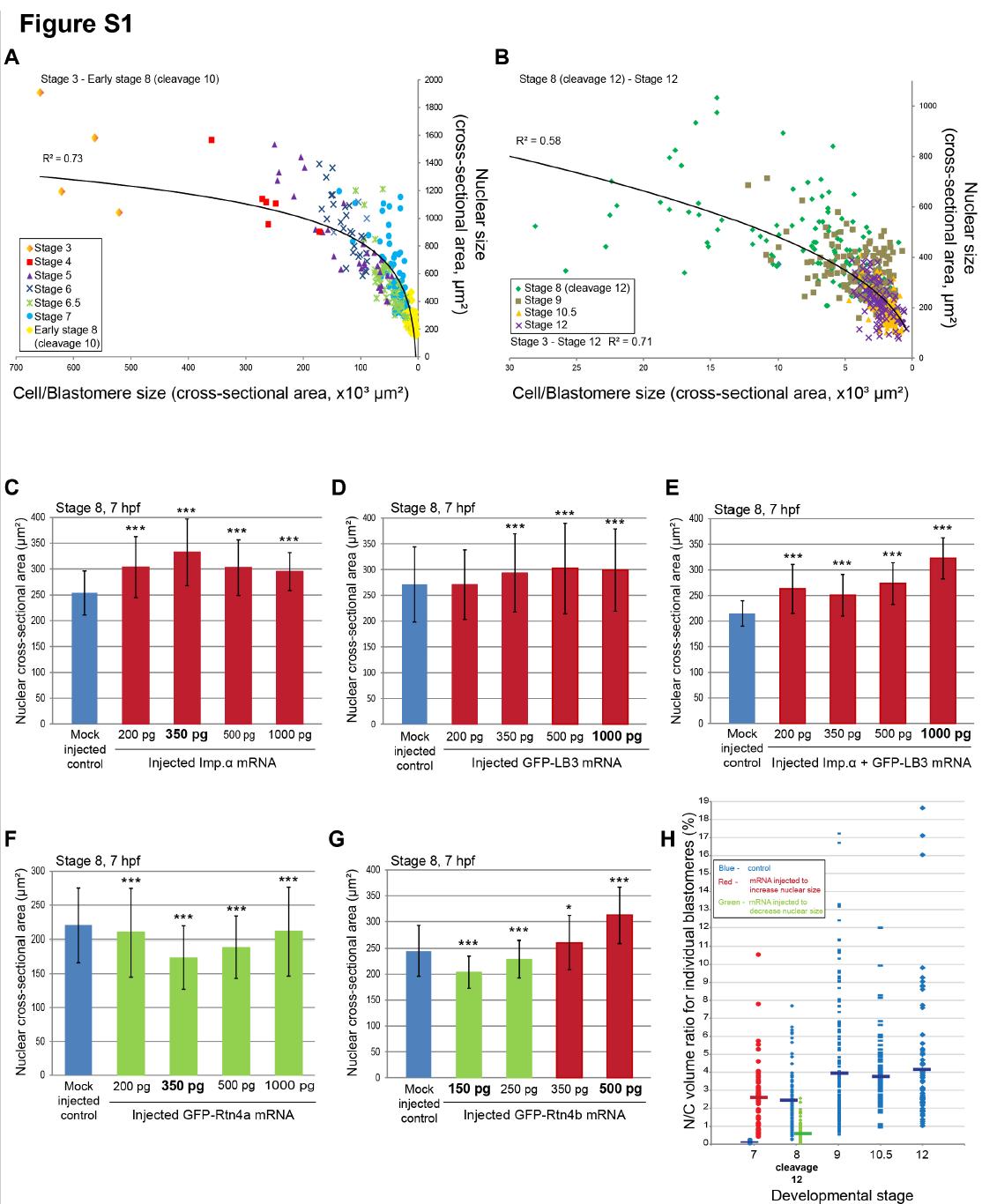 Figure S1, Related to Figures 1 and 2. Nuclear size and cell size scale during Xenopus early development and titration of nuclear scaling factors alters nuclear size (A) Raw data used to generate the plots in Figure 1 are shown, specifically nuclear versus cell cross-sectional areas for stage 3 to early stage 8 (cleavage 10). The data were fit to a power trend line and the R2 value is shown for all data points. Embryos from three different batches of eggs were used, and for each stage, at least 10 embryos were used. Numbers of blastomeres analyzed were: Stage 3, n=4; Stage 4, n=6; Stage 5, n=28; Stage 6, n=29; Stage 6.5, n=48; Stage 7, n=86; early stage 8, n=83. (B) Raw data used to generate the plots in Figure 1 are shown, specifically nuclear versus cell cross-sectional areas for stage 8 (cleavage 12) to stage 12. The data were fit to a power trend line and the R2 value is shown for all data points. Embryos from three different batches of eggs were used, and for each stage, at least 10 embryos were used. Numbers of blastomeres analyzed were: Stage 8, n=112; Stage 9, n=139; Stage 10.5, n=123; Stage 12, n=138. (C-G) One-cell embryos were microinjected with the indicated amounts of mRNAs. Nuclei were isolated from stage 8 embryos and visualized by immunofluorescence using mAb414. Nuclear cross-sectional area was quantified for at least 500 nuclei from ~100 embryos for each condition. Highlighted in bold are the amounts of injected mRNA that maximally increased or decreased nuclear size and that were used in Figures 2-4 and S2-4. Data from one representative experiment of three are shown. Error bars represent SD, *** P<0.001; * P<0.05. (H) Nuclei were visualized in isolated blastomeres at the indicated stages by wholemount immunocytochemistry and N/C volume ratios were quantified as in Figure 1. N/C volume ratios for individual blastomeres are plotted. N/C ratios shown in blue represent control blastomeres and were calculated from the data shown in Figure S1A-B. N/C ratios shown in red represent blastomeres with increased nuclear size (i.e. injected with importin α + GFP-LB3 or GFP-Rtn4b high concentration). N/C ratios shown in green represent blastomeres with decreased nuclear size (i.e. injected with GFP-Rtn4a or GFP-Rtn4b low concentration). Stage 7 blastomeres with increased nuclear size, n=55; stage 8 blastomeres with decreased nuclear size, n=83. Short thick horizontal lines indicate mean values for each stage. |
