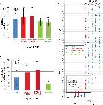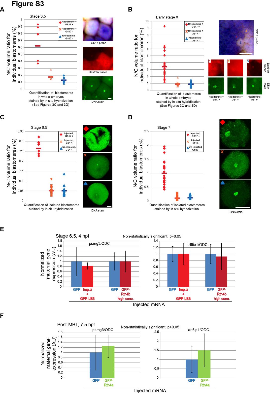 Figure S3, Related to Figure 3. Premature GS17 zygotic gene expression strongly correlates with increased N/C volume ratios, and altering the N/C volume ratio does not change maternal transcript expression levels determined by qPCR (A,B) One blastomere of a two-cell embryo was co-injected with rhodamine-labeled dextran and mRNA to increase nuclear size (either Imp.α + GFP-LB3 or GFP-Rtn4b high concentration) in half of the embryo. Embryos were allowed to develop to stage 6.5 (A) or early stage 8 (B) and stained for GS17 by whole mount in situ hybridization (see Figure 3A-D). Nuclei were visualized with Sytox Green, and cell and nuclear crosssectional areas were measured. N/C volume ratios were extrapolated from these measurements for cells that received the mRNA and stained for GS17 (rhodamine+ GS17+), cells that received the mRNA and showed weak or absent GS17 staining (rhodamine+ GS17-), and cells that did not receive the mRNA and did not stain for GS17 (rhodamine- GS17-). Numbers of stage 6.5 blastomeres analyzed were: rhodamine+ GS17+, n=6; rhodamine+ GS17-, n=5; rhodamine- GS17-, n=12. Numbers of early stage 8 blastomeres analyzed were: rhodamine+ GS17+, n=28; rhodamine+ GS17-, n=13; rhodamine- GS17-, n=20. Mean values are indicated by thick horizontal lines. Scale bars, 50 μm. (C,D) One-cell embryos were microinjected with mRNA (GFP-Rtn4b high concentration) to increase nuclear size. Blastomeres were isolated from injected and un-injected embryos at stages 6.5 and 7 and stained for GS17 by whole mount in situ hybridization. Nuclei were visualized with Sytox Green, and cell and nuclear cross-sectional areas were measured. From these data, N/C volume ratios were calculated for blastomeres from injected embryos that stained for GS17 (injected, GS17+), blastomeres from injected embryos that did not stain for GS17 (injected, GS17-), and blastomeres from un-injected embryos that did not stain for GS17 (un-injected, GS17-). Numbers of stage 6.5 isolated blastomeres analyzed were: injected, GS17+, n=7; injected, GS17-, n=13; un-injected, GS17-, n=15. Numbers of stage 7 isolated blastomeres analyzed were: injected, GS17+, n=25; injected, GS17-, n=36; un-injected, GS17-, n=16. Mean values are indicated by thick horizontal lines. Scale bars, 50 μm. (E,F) One-cell embryos were microinjected with the indicated mRNAs to increase (E) or decrease (F) nuclear size and allowed to develop to stage 6.5 (E) or late stage 8 (F). Total RNA was isolated from 12 embryos for each condition and converted to cDNA. Expression levels of two maternal genes (psmg3 and arl6ip1) were determined by qPCR, normalized to ODC. Gene expression levels are plotted in arbitrary units (AU) relative to GFP mRNA injected control embryos. The means from two independent experiments are shown, error bars represent SD, and all differences are not statistically significant compared to the GFP controls (P>0.05). |