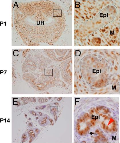 Figure 1. Bmp signaling was enhanced with the prostatic epithelial cell differentiation. A and B, Coronal sections of caudal body of ICR mice at P1; pSmad1/5/8 was weakly detected in the immature prostatic epithelia. C–F, Coronal sections of AP at P7 (C and D) and P14 (E and F). E and F, pSmad1/5/8 signal was more prominently observed in the differentiated luminal cells (F, red arrowhead) than that of the basal cells (F, black arrow) in the AP. UR, urethra. Epi, epithelia; M, mesenchyme. Scale bars, 100 μm. |