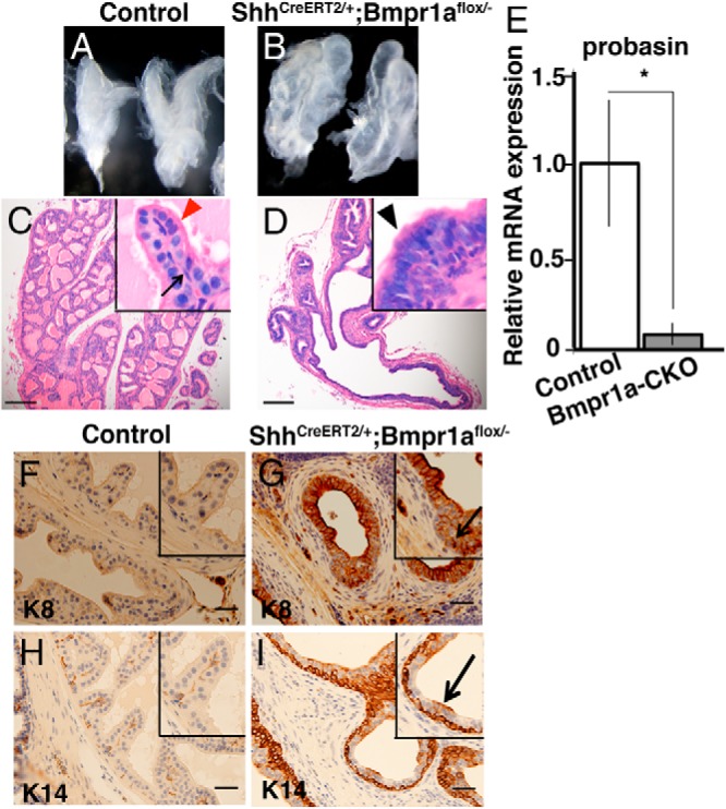 Figure 3. Abnormal stratification and decreased mRNA level of secretory protein in the Bmpr1a-CKO mutant prostate. A, Control AP ducts at P28. B, Bmpr1a-CKO mutant AP at P28. C, Histologic section of the control prostate. Inset, Luminal cells (red arrowhead) and basal cells (black arrow) were observed. D, Histology of the Bmpr1a-CKO mutant prostate. Inset, Abnormally stratified epithelia were observed (black arrowhead). Scale bars, 100 μm. E, Probasin mRNA expression was decreased in the mutant AP at P28. The relative RNA equivalents for each sample were normalized by the RNA levels for ribosomal protein L8. Error bars represent the mean ± SE of 7 tissue samples. Statistical significance was indicated by an asterisk. F and G, Expression of K8 in control (F) and mutant (G) prostate. K8-positive basal side epithelia were indicated (G, black arrow). H and I, Expression of K14 in control (H) and mutant (I) prostate. K14-positive luminal side epithelia were indicated (I, black arrow). Increased levels of K8 (G) and K14 (I) were detected in the Bmpr1a-CKO mutants at P49. Scale bars, 20 μm. |