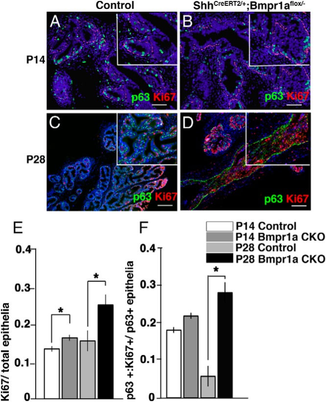 Figure 4. Basal cell proliferation increases in the Bmpr1a-CKO mutants. AâD, Costaining for Ki67 and p63 at P14 (A and B) and P28 (C and D) was performed. E, Ki67-positive epithelia were quantified at P14 and P28. F, Cells positive for both Ki67 and p63 were quantified at P14 and P28. Scale bars, 50 μm. Significantly increased ratios of proliferative epithelia (E) and proliferative basal cells at P28 (F) were detected. Data are presented as means of 3 values ± SE. Statistical significance was calculated using Student's t test followed by the F test (*, P < .05). |