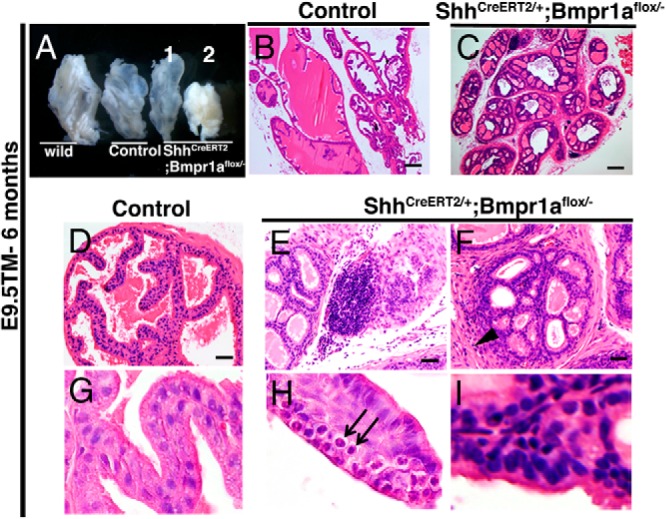 Figure 6. Stromal hyperplasia and inflammation with enlarged epithelial nuclear structures were observed in the Bmpr1a-CKO mutants. A, Morphology of AP in wild-type, ShhCreERT2/+;Bmpr1a-flox/+ (Control), and ShhCreERT2/+; Bmpr1a-flox/− mice at 6 months of age. B, D, and G, Histology of control AP. C, E, F, H, and I, The sections of the epithelial-specific Bmpr1a-CKO mutant AP. B–I, Sections stained with hematoxylin and eosin showed inflammatory cells in the stroma (E), stromal hyperplasia (F, black arrow head), inflammatory cells (H, black arrows), and enlarged nuclear structures (I) in the AP of Bmpr1a-CKO mice. A and B, Scale bars, 200 μm. D–F, Scale bars, 20 μm. |