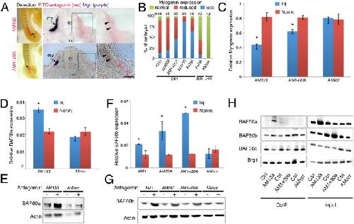 Fig. 4. Inhibition of miRNAs abrogates myogenesis and alters Brg1/BAF subunit composition. (A) Antagomir (AM) injections followed by in situ detection of myogenin transcripts (purple) and FITC-labeled AMs (red) shows loss or reduction of myogenin expression on the injected side (arrows and arrowheads). Whole-mounts and sections are shown. my, myotome; nt, neural tube; nc, notochord. Scale bars: 50â μm. (B) Percentage of embryos that displayed normal, reduced or no myogenin expression following different AM injections. AMall, all three AMs combined; AMscr, scrambled AM. Embryos were incubated for 24 or 48â h as indicated. (C) qPCR detecting relative amounts of myogenin transcripts in somites injected as indicated. (D) qPCR shows increased BAF60a expression in somites injected with AM133 compared with non-injected somites. Somites injected with AMscr do not have elevated BAF60a levels compared with non-injected somites. (E) BAF60a was detected by western blot in somites injected with AM133 or AMscr; (â) indicates non-injected control side. BAF60a variant was elevated after miR-133 inhibition. (F) qPCR shows increased BAF60b expression in somites injected with AM1, AM206, or both, compared with non-injected somites. Somites injected with AMscr do not have elevated BAF60b levels compared with non-injected somites. (C,D,F) Error bars indicate s.d.; *P<0.05 (t-test). (G) BAF60b detected by western blot in somites injected as indicated; (â) indicates non-injected side. BAF60b variant was elevated after miR-1/miR-206 inhibition. (H) CoIP using anti-Brg1 antibody and protein extracts from somites injected with AM133, versus non-injected somites, shows increased amounts of BAF60a protein complexed with Brg1 in the AM133-injected sample. The amount of BAF60c variant that co-precipitated with Brg1 was reduced in the AM133-injected sample (lanes 1, 2). CoIP using Brg1 antibody and protein extracts from somites injected with AM1 and AM206, versus non-injected control, shows an increased amount of BAF60b protein complexed with Brg1 in the AM1- and AM206-injected sample. The amount of BAF60c variant that co-precipitated with Brg1 was reduced in the AM1- and AM206-injected sample (lanes 3, 4). CoIP using anti-Brg1 antibodies and protein extracts from somites injected with AMscr, or from non-injected somites, show that similar amounts of BAF60 variants were complexed with Brg1 in both samples (lanes 5, 6). Input samples (lanes 7-12) show increased BAF60a and BAF60b after AM133 and AM1/206 injections, respectively. |