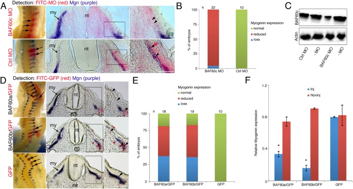 Fig. 2. MO knockdown of BAF60c or misexpression of BAF60a or BAF60b variants inhibits myogenesis. (A) Electroporation of BAF60c-MO or control-MO into somites on one side, followed by in situ hybridization for myogenin (purple) and detection of the FITC-coupled MO (red). Whole-mount views and sections show that BAF60c-MO led to localized myogenin loss (arrows and arrowheads), whereas control-MO had no effect. (B) Percentage of embryos with an effect on myogenin expression after BAF60c-MO injection. (C) Western blot of pooled somites shows reduced BAF60c protein levels in BAF60c-MO electroporated somites, when compared with control-MO or to somites from the non-injected side (–MO). MO electroporations are mosaic and images shown in A give a spatial resolution, whereas the western blot in C averages what occurs in all cells across the somite. (D) Whole-mount double in situ hybridization and sections show that misexpression of BAF60a or BAF60b variants in somites leads to localized loss of myogenin expression. Myogenin is in purple (arrows and arrowheads) and GFP transcripts, which are expressed from a separate, co-injected plasmid, are in red. The ratio of BAF60 expression plasmid to GFP expression plasmid is 5:1. (E) Myogenin expression phenotypes observed after electroporation. (F) qPCR shows reduced myogenin expression in somites electroporated with BAF60a or BAF60b expression vectors when compared with GFP plasmid controls. Material from multiple embryos was pooled. Error bars indicate s.d.; *P<0.05 (t-test). my, myotome; nt, neural tube; nc, notochord. Scale bars: 50 μm. |