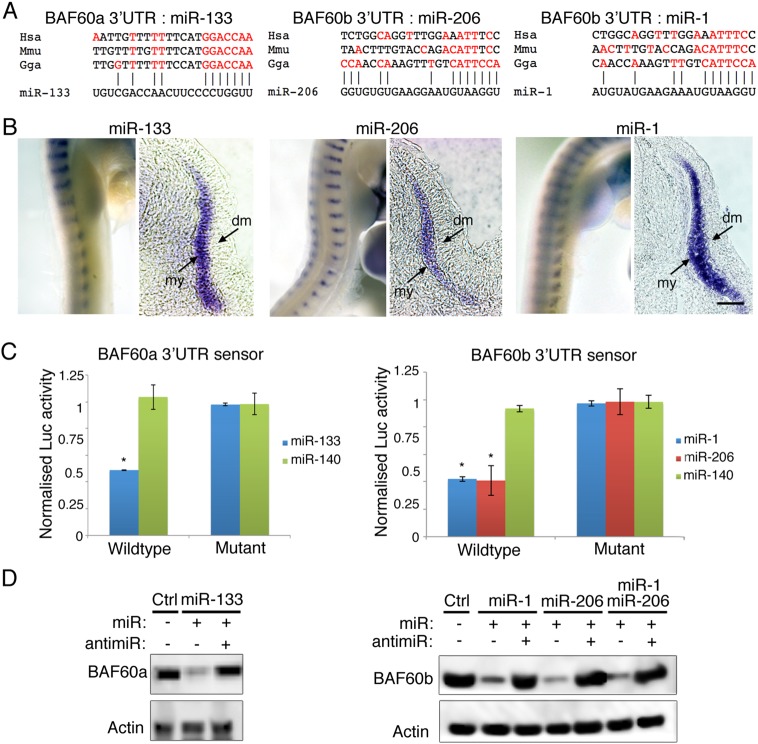 Fig. 3. miR-133 and miR-1/206 regulate the expression of BAF60a and BAF60b variants. (A) Alignment of putative miR-133, or miR-206 and miR-1 target sites in the 3′UTRs of chick (Gallus gallus, Gga), human (Homo sapiens, Hsa) and mouse (Mus musculus, Mmu) BAF60a and BAF60b genes. Nucleotides complementary to the respective miRNA are in red. The seed sequence of miR-133 is complementary to the predicted target site in the BAF60a 3′UTR and this is conserved in all three species. There is little variation outside the seed sequence. The seed sequences of miR-1 and miR-206, which are identical, are complementary to the predicted target site in the chicken BAF60b 3′UTR. In human and mouse BAF60b 3′UTR, fewer nucleotides are complementary to the miR-1 or miR-206 seed sequence, suggesting a non-canonical binding site where nucleotides outside the seed compensate. The number and position of complementary nucleotides outside the seed sequence vary between species and between miR-1 and miR-206, as these miRNAs differ outside the seed. In human/mouse, BAF60a and BAF60b are known as SMARCD1/Smarcd1 and SMARCD2/Smarcd2, respectively. (B) In situ hybridization using LNA probes shows myotome-specific expression of miR-133, miR-206 and miR-1 in HH20 embryos. my, myotome; dm, dermomyotome. Scale bar: 50 μm. (C) Luciferase sensors containing 3′UTR sequences of chick BAF60a or BAF60b were transfected into DF1 cells. Co-transfection of miR-133, miR-1 or miR-206 led to downregulation of luciferase expression compared with controls. Point mutations in the putative target site rendered the sensors non-responsive. Error bars indicate s.d.; *P<0.05 (t-test). (D) Endogenous BAF60a and BAF60b proteins are regulated by miR-133 or miR-1/206 in mouse NIH3T3 cells. Transfection with miR-133 led to reduced BAF60a protein levels; co-transfection of miR-133 with antimiR-133 restored BAF60a protein levels to that of mock transfected controls. Transfection with miR-1 or miR-206 or both led to reduced BAF60b protein levels; co-transfection of miRNAs with the relevant antimiR restored BAF60b protein levels to that of mock transfected controls. |
