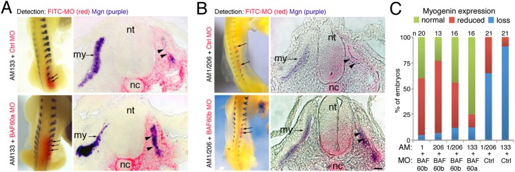 Fig. 5. Knockdown of BAF60a or BAF60b restores myogenesis after miRNA inhibition. (A) Somites injected with AM133 were electroporated with FITC-labeled control-MO or BAF60a-MO, as indicated. In situ hybridization for myogenin transcripts (purple) and detection of FITC-MO (red) shows that myogenic differentiation is inhibited in the presence of AM133 plus control-MO (top row, arrows and arrowheads); whole-mount and section are shown. Co-electroporation of BAF60a-MO with AM133 rescued the expression of myogenin (bottom row). (B) Somites injected with AM1 plus AM206 were electroporated with FITC-labeled control-MO or BAF60b-MO, as indicated. In situ hybridization for myogenin transcripts (purple) and detection of FITC-MO (red) shows that myogenic differentiation is inhibited in the presence of AM1 and AM206 plus control-MO (top row, arrows and arrowheads). Myogenin expression is rescued when BAF60b-MO is co-electroporated with AM1 and AM206 (bottom row, arrows and arrowheads). Scale bar: 50âµm. (C) Summary of phenotypes observed after AM/MO injections. my, myotome; nt, neural tube; nc, notochord. |