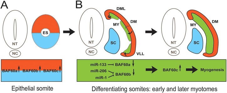 Fig. 6. Model illustrating the expression and regulation of BAF60 variants in embryonic somites by myomiRs. (A) All BAF60 variants are expressed throughout epithelial somites. The coloring indicates different cell lineages; the ventral half contains chondrogenic progenitors (blue) and the dorsal half contains myogenic progenitors (red). (B) In differentiating somites miR-133, miR-1 and miR-206 are expressed in the myotome (green), which is generated from the edges of the dermomyotome (red), as indicated by arrows. We propose that myomiRs decrease the levels of BAF60a and BAF60b protein available to bind to Brg1, thus allowing an increase in BAF60c to be incorporated into the BAF/Brg1 complex. This switch in complex composition permits activation of myogenic differentiation in embryonic myocytes. The continued presence of high levels of BAF60a and BAF60b variants interferes with myogenic differentiation, presumably by displacing BAF60c from the Brg1 chromatin remodeling complex. ES, epithelial somites; DML, dorsomedial lip; VLL, ventrolateral lip; DM, dermomyotome; MY, myotome; NT, neural tube; NC, notochord; SC, sclerotome. |