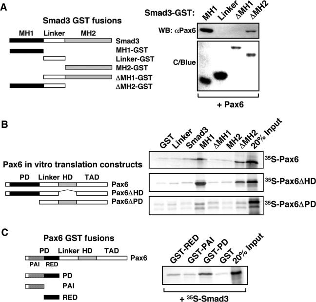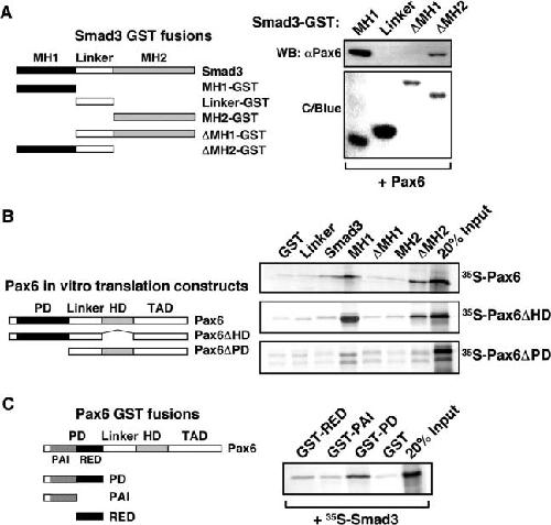 Figure 4. The MH1 domain of Smad3 interacts primarily with the paired domain of Pax6. (A) Lysates were prepared from HEK-293 cells that had been transiently transfected with pcDNA3-Pax6. These were then incubated with GST-Smad truncated proteins as indicated in the left-hand schematic diagram and, following extensive washing, associated proteins were identified by elution of beads with SDS-Laemmli buffer, separation by 10% SDS-PAGE, and western blotting using a specific Pax6 antibody. The presence of the GST proteins was confirmed by staining gels with Coomassie Blue (C/Blue). (B) Pax6 constructs used for in vitro translation are shown in the left-hand panel. GST pull-down assays were performed with full-length Smad3 and different domains of Smad3 fused to GST and immobilized on glutathione-agarose beads and Pax6, Pax6ΔHD and Pax6ΔPD produced by in vitro transcription and translation in the presence of [35S]-methionine. Ten-microliter portions of the in vitro translation reactions were preincubated with GST immobilized on glutathione-agarose beads before incubation with the GST fusion proteins. The GST beads, GST-Pax6ΔHD beads and GST-Pax6ΔPD beads were washed several times before they were boiled and run on a 10% SDS–polyacrylamide gel. Two microlitres of the in vitro translated proteins were run on the same gel to visualize the signal from 20% of the input as shown in the middle panel. (C) GST-Pax6 sub-paired domain constructs are shown in the left-hand schematic panel. The right panel shows the results of GST pull-down assays with the paired domain (PD) of Pax6 and the two sub-domains, PAI and RED fused to GST and immobilized on glutathione–agarose beads and Smad3 or Smad4 produced by in vitro transcription and translation in the presence of [35S]-methionine. Samples were prepared and separated as described above in Section B.