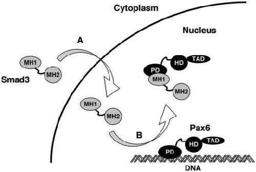 The MH1 domain of Smad3 interacts with Pax6 and represses autoregulation of the Pax6P1 promoter.