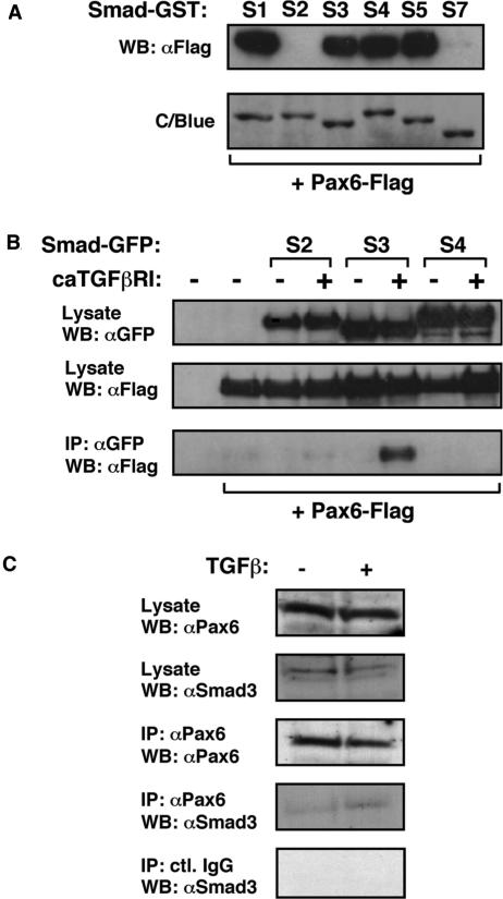 Figure 3. Interaction of Smads with Pax6. (A) Pax6 interacts with Smad1, 3, 4 and 5 in vitro. Lysates were prepared from HEK-293 cells that had been transiently transfected with p3xFlag-Pax6. These were then incubated with GST-Smad proteins bound onto glutathione beads. Following extensive washing, Pax6 associated with the Smad-GSTs was identified by elution of beads with SDS-Laemmli buffer, separation by 10% SDS-PAGE, and western blotting using a specific Pax6 antibody (Santa Cruz, cat. No. SC-20). GST alone was used as a control. The presence of the GST proteins was confirmed by staining gels with Coomassie Blue (C/Blue). (B) Pax6 interacts with Smad3 in the presence of constitutively activated TGFβ receptor I in vivo. HEK-293 cells were transfected as indicated. Pax6-Flag was immunoprecipitated with anti-FLAG antibody. Samples were separated by 10% SDS-PAGE and immunoblotted with anti-GFP antibody. (C) Pax6 and Smad3 interact endogenously in response to TGFβ stimulation of human lens epithelial cells.
