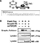 Figure 5. Smad3 prevents Pax6 paired domain from binding DNA. (A) Schematic representation of the experimental protocol for the DNA absorption assay together with the sequence of the biotinylated P6CON aptamer. (B) Biotinylated double-stranded P6CON oligonucleotide immobilized on streptavidin beads was incubated with lysates of HEK-293 cells transfected with the indicated expression plasmids. Pax6 bound to P6CON was analysed by immunoblotting using anti-Flag antibodies. The lower panels show the expression levels of Pax6-Flag and Smad3-HA proteins as analysed in immunoblots of the cell lysates.