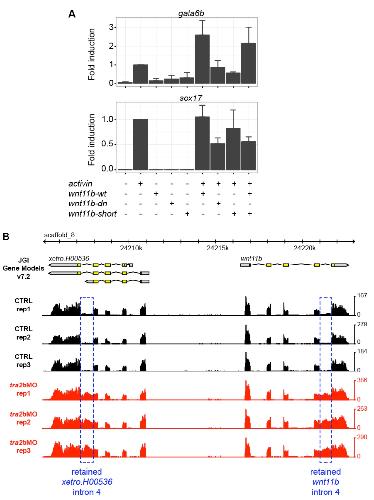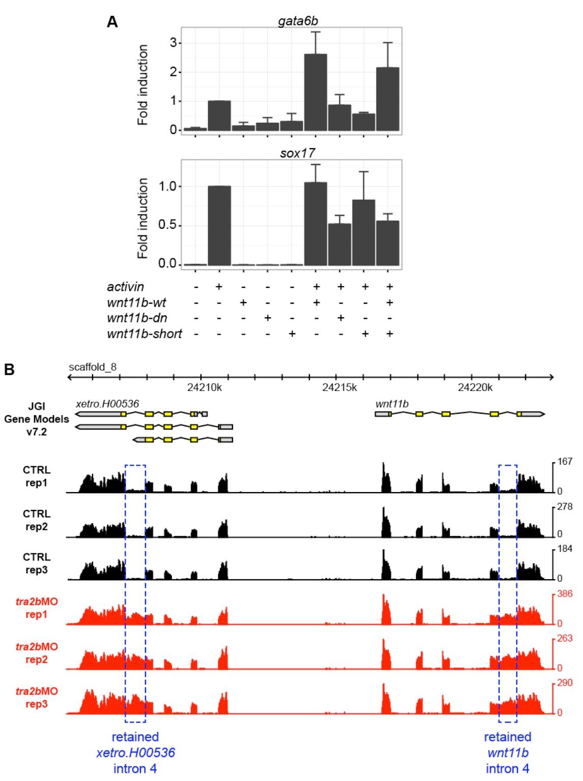 Figure S4, Related to Figure 4. Induced cardiac gene expression in animal caps and wnt11b gene duplication in X. tropicalis. (A) Animal caps injected with combinations of activin and wnt11b isoforms assayed for gata6b and sox17 by RTqPCR. Coinjection of activin with wnt11b induces the cardiac mesoderm marker gata6b, whereas coinjection of activin with wnt11-dn or wnt11-short does not. The endodermal marker sox17 is induced by activin but not by either wnt11b isoform, as expected. Bar plots show mean of three independent experiments + SEM of normalized fold-induction compared to activin injected embryos. (B) JGI gene models for the annotated wnt11b (right) and the adjacent duplication transcribed from the opposite strand (xetro.H00536; left). RNA-seq read profiles show increased retention of intron4 in both genes in tra2b morphants (blue dotted box). |
