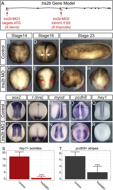 Figure 1. Tra2b Is Required for Somite Formation and Normal Embryogenesis (A) A translation-blocking MO was used in X. laevis, and a splice-blocking MO was used in X. tropicalis. (B and C) Delayed gastrulation in tra2b morphants at stage 14; red arrow indicates protruding mesendoderm in morphants (103/110 embryos). (D and E) Neural tube closure defects at stage 18. White arrows indicate fused neural folds in control embryos; red arrows point to neural folds in the open neural plate of morphants (98/101 embryos). (FâH) Axis elongation defects and endoderm detachment at stage 23. Red arrows in (G) and (H) indicate endoderm detaching from the embryo through the blastopore (87/99 embryos). (BâE) Dorsal view with anterior up. (F and G) Lateral view with anterior to the left. (H) Posterior view with dorsal up. (IâR) In situ hybridization (ISH) on control and tra2b morphants. (IâL) Neural plate morphology (sox2) and mesoderm specification (t/bra) at stage 15. (M and N) Paraxial mesoderm forms in tra2b morphants, but does not segregate into segmented muscle blocks. White arrow in (M) indicates segregated muscle block in control embryo. (O and P) Presomitic mesoderm (PSM) is present in tra2b morphants (white brackets), but presomitic stripe formation is compromised. White arrow in (O) indicates normal stripe pattern, red arrow in (P) points to smaller and fewer stripes in tra2b morphants. (Q and R) Mature somites marked by hey1 are almost completely absent in tra2b morphants. (S and T) Quantification of hey1-positive somites and pcdh8-positive stripes in control and tra2b morphants. Bars show mean + SD; âââ indicates that the difference compared with control is significant at p < 2.2 Ã 10â16 (t test). Number of embryos used for quantification: 63 (ctrl, hey1), 58 (tra2bMO, hey1), 68 (ctrl, pcdh8), and 59 (tra2bMO, pcdh8). Embryos shown are X. laevis. See also Figure S1. |