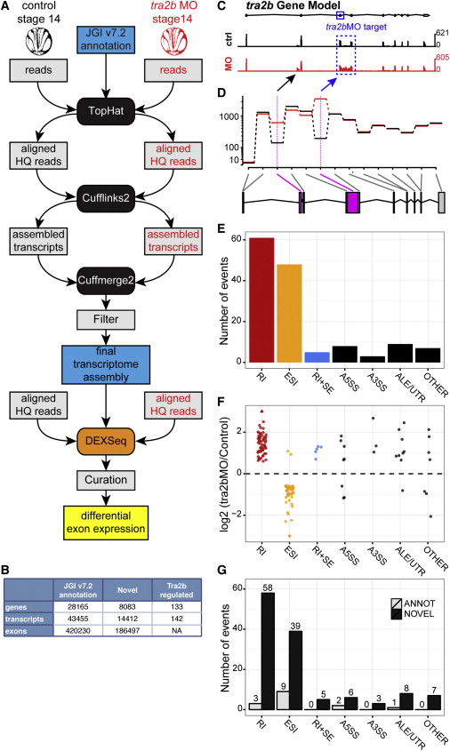 Figure 2. Analysis of Alternative Splicing in tra2b Morphants Shows Intron Retention as the Most Common Splice Change (A) Outline of the RNA-seq analysis pipeline. Condition-specific transcript assemblies are merged with JGI annotation, resulting in an augmented transcriptome assembly that forms the basis for DEXSeq testing of differential exon expression. (B) Table showing the number of novel transcripts found in this study and the number of significant splice changes in tra2b morphants. (C) RNA-seq reads from X. tropicalis control and morphants in tra2b locus show MO-induced intron retention (RI, blue box) and an increase in variable exon 2 (black arrow). (D) DEXSeq output showing fitted splicing (a proxy for the number of reads aligned) across all exonic regions. Control (black) and morphant (red) exon expression is similar except for the variable exon 2 and MO-induced retained intron, where the graphs diverge. Both events are significant (purple exons indicate adjusted p < 0.05). (E) Alternative splicing changes in morphants grouped by category show RI (red) as the most common event, followed by skipped or included exons (ESI, yellow). (F) A plot of individual alternative splicing events shows that retained introns are always included in morphants, whereas ESI events in all but two instances are included in normal embryos. (G) Most of the alternative splicing events detected are novel and are not described in the annotation. See also Figure S2 and Tables S1 and S2. |