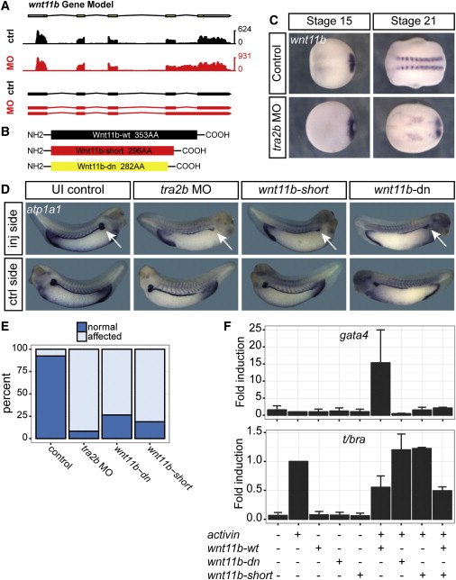 Figure 4. tra2b Knockdown Reveals a Novel Inhibitory wnt11b Isoform (A) RNA-seq read profile and Cufflinks assembled transcripts on the wnt11b locus show retention of intron 4. The top panel shows the JGI gene model for wnt11b, and the middle and bottom panels show read profiles and Cufflinks-assembled transcripts from control and morphants. (B) Intron 4 retention results in a truncated protein (red, Wnt11b-short) resembling a dominant-negative ligand (yellow) that lacks 57 C-terminal residues compared with normal (black). (C) wnt11b is expressed in the presomitic mesoderm/circumblastoporal region and somites. Embryos are shown in dorsal view with anterior to the left. (D) wnt11b-short mimics wnt11b-dn in a pronephric tubule inhibition assay. Embryos were injected unilaterally into the prospective lateral mesoderm and examined by ISH for atp1a1, which marks the developing pronephros. Arrows point to the proximal pronephric tubules on the injected side. (E) Summary of the pronephros tubule inhibition assay. Number of embryos scored: 144 (control), 72 (tra2bMO), 87 (wnt11b-dn), and 69 (wnt11b-short). (F) qRT-PCR for induced cardiac gene expression (gata4) or axial mesoderm (t/bra) on animal caps injected with combinations of activin, wnt11b, wnt11b-dn, and wnt11b-short, showing that wnt11b-short acts similarly to wnt11b-dn and counters the effect of wnt11b. Bar plots show the mean of three independent experiments + SEM of normalized fold induction compared with activin-injected embryos. (A) shows data from X. tropicalis and (C)â(F) show data from X. laevis. See also Figure S4. |