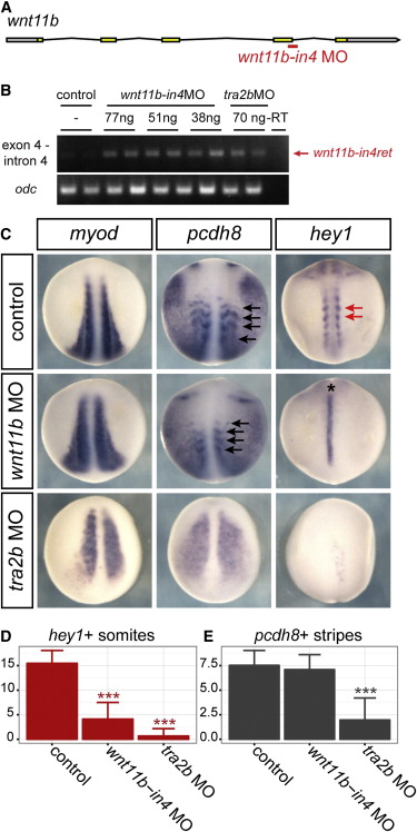 Figure 5. RI in wnt11b Is Responsible for Somite Defects in tra2b Morphants (A) Diagram showing X. laevis wnt11b gene structure and the wnt11b-in4 MO (red). (B) RT-PCR on stage 19 single embryos injected with wnt11b-in4 MO or tra2b MO shows efficient retention of intron 4. The top panel shows RT-PCR with primers in wnt11b exon 4 and intron 4, and the bottom panel shows the internal control odc. (C) ISH for mesodermal gene expression in wnt11b-in4 MO- and tra2b MO-injected embryos. Black arrows in pcdh8-stained embryos indicate the presence of somitic stripes in control and wnt11b-in4 MO-injected embryos. Red arrows in hey1-stained embryos indicate mature somites in control embryos, which are absent in wnt11b-in4 and tra2b morphants. The asterisk (â) in hey1 samples indicates nonsomitic midline hey1 expression, which is exposed because of a neural tube closure defect. All pictures show dorsal views with anterior up. (D and E) Quantification of ISH results, showing the mean and SD of the number of hey1+ somites (D) and pcdh8+ stripes (E); âââ indicates that difference is statistically significant from control at p < 2.2 Ã 10â15 (t test). Number of embryos used for quantification: 41 (ctrl, hey1), 30 (tra2bMO, hey1), 43 (wnt11bMO, hey1), 42 (ctrl, pcdh8), 32 (tra2bMO, pcdh8), and 43 (wnt11bMO, pcdh8). Data shown are from X. laevis. |
