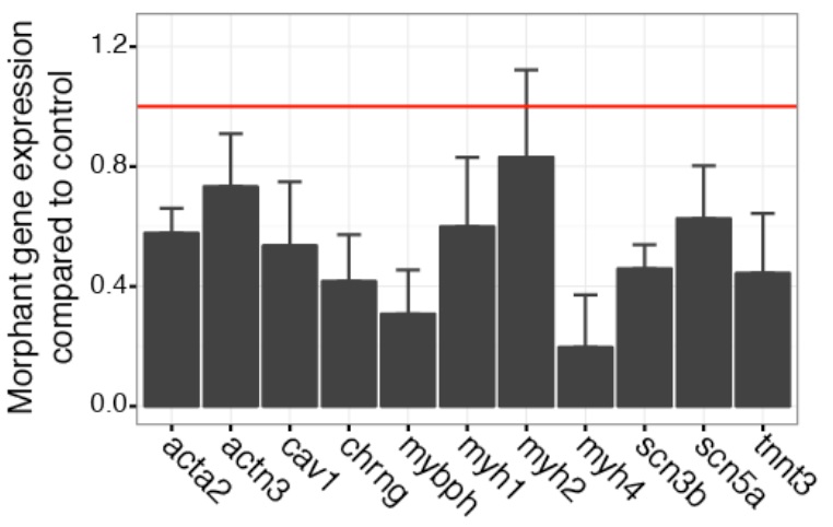 Figure S3, Related to Figure 3. Confirmation of differentially expressed musclerelated genes in tra2b morphants. RT-qPCR on genes with associated muscle GO terms that are differentially expressed in tra2b morphants. Bars show mean of three biological replicates and SEM normalized to control embryo expression. Red horizontal line indicates control level. Data shown are from X. tropicalis. |