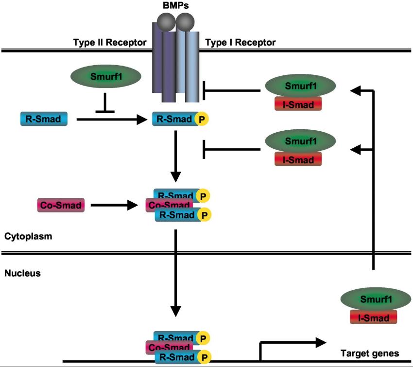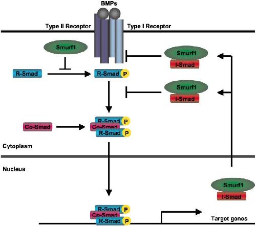 Figure 7. Inhibition of BMP signaling by Smurf1 through multiple mechanisms. In the absence of BMP signaling, Smurf1 interacts with BMP-specific R-Smads and induces their degradation to maintain low basal levels of them. In the presence of BMP signaling, Smurf1 targets activated type I receptors and BMP-specific R-Smads for ubiquitin-dependent degradation. I-Smads, induced by BMPs, act as adaptors in this process.