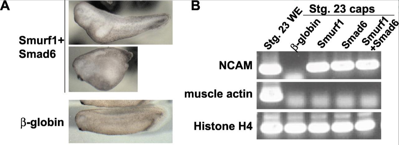 Figure 1. Smurf1 and Smad6 synergistically inhibit endogenous BMP signaling in Xenopus embryos. (A) Smad6 (500 pg) and Smurf1 (500 pg) RNAs were injected near the ventral midline of four-cell embryos. Resultant phenotypes are shown (top, secondary axis; middle panel, hyperdorsalized embryo). When 1000 pg of β-globin RNA was injected, embryos developed normally (bottom). (B) RNAs encoding β-globin (1000 pg), Smurf1 (1000 pg), Smad6 (1000 pg), or Smurf1 (250 pg) and Smad6 (250 pg) were injected near the animal pole of two-cell embryos. Animal caps were isolated from embryos at blastula stage 8 and cultured to stage 23. RNAs were extracted from pooled caps and control embryos and subjected to RT-PCR analysis. WE, whole embryo.
