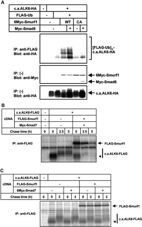 Figure 4. Smurf1âI-Smad complexes target ALK6 for ubiquitin-dependent degradation. (A) Smad6 enhances ubiquitination and degradation of ALK6 by Smurf1. Ubiquitination of c.a.ALK6 by Smad6âSmurf1 complexes was examined. 293T cells were transfected with the indicated plasmids and treated with 2.5 μM of lactacystin for 24 h before cell lysis. Lysates from cells were subjected to anti-FLAG immunoprecipitation followed by anti-HA immunoblotting. Polyubiquitination species of constitutively active forms of ALK6 ([FLAG-Ub]n-c.a.ALK6-HA) are indicated in the top panel. (B and C) Smurf1âSmad7 complex induced rapid turnover of ALK6. COS7 cells were transfected with c.a.ALK6-FLAG, FLAG-Smurf1, and/or Myc-Smad7. [35S]methionine- and cysteine-labeled cell lysates were immunoprecipitated by FLAG antibody. Immune complexes were subjected to SDS-PAGE and examined using a Fuji BAS 2500 bio-imaging analyzer. Arrowheads indicate the premature form of ALK6.