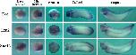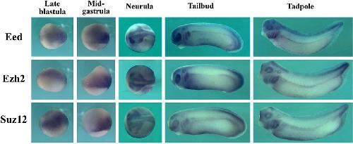 Fig. 1. Expression of the PRC2 core components during early Xenopus development. Eed, Ezh2 and Suz12 are expressed similarly in early Xenopus embryos. Their transcripts are detected in the pan-mesoderm in late blastulae and early gastrulae embryos, but are shifted to dorsal mesodermal and dorsal ectodermal cells at late gastrula stages. During neurulation, their RNAs are located in neural and neural crest cells. At tailbud and tadpole stages, these genes are expressed in neural, sensory organs and migrating neural crest cells. |