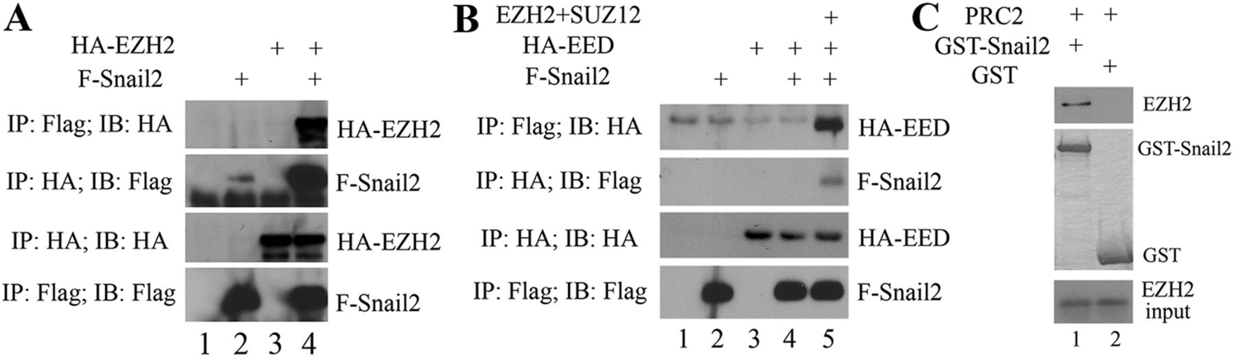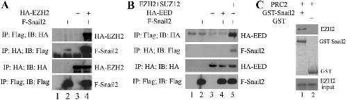 Fig. 3. EZH2 interacts directly with Snail2. RNAs (1-2â ng) encoding tagged and untagged PRC2 proteins and Flag-Snail2 were injected alone or together, and proteins were extracted at gastrula stages 10-11 for IP and western blot analyses. (A) Reciprocal co-IP assay demonstrated that HA-EZH2 interacts with Flag-Snail2 in Xenopus embryos. (B) HA-EED and Flag-Snail2 do not co-precipitate. However, in the presence of EZH2 and SUZ12, HA-EED was pulled down by anti-Flag antibody, indicating that Snail2 recruited the entire PRC2 complex. (C) Purified GST-Snail2, but not GST, pulled down commercially available purified EZH2 directly. |