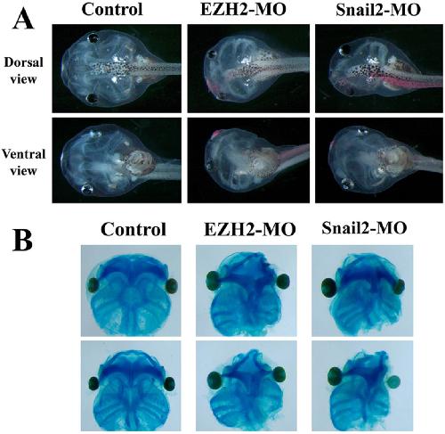 Fig. 7. EZH2 regulates formation of craniofacial cartilages. 20â ng EZH2-MO or Snail2-MO was injected unilaterally into two-cell-stage embryos. The embryos were cultured to the tadpole stages for Alcian Blue staining of the craniofacial cartilages. (A) Knockdown of either EZH2 or Snail2 led to malformation of craniofacial structures on the injected side (labeled by Red-Gal staining). (B) Alcian Blue staining revealed that the neural crest-derived craniofacial cartilages (Meckel's, ceratohyal and ceratobranchial cartilages) were defective on the side injected with EZH2-MO or Snail2-MO (right side of the panels). |
