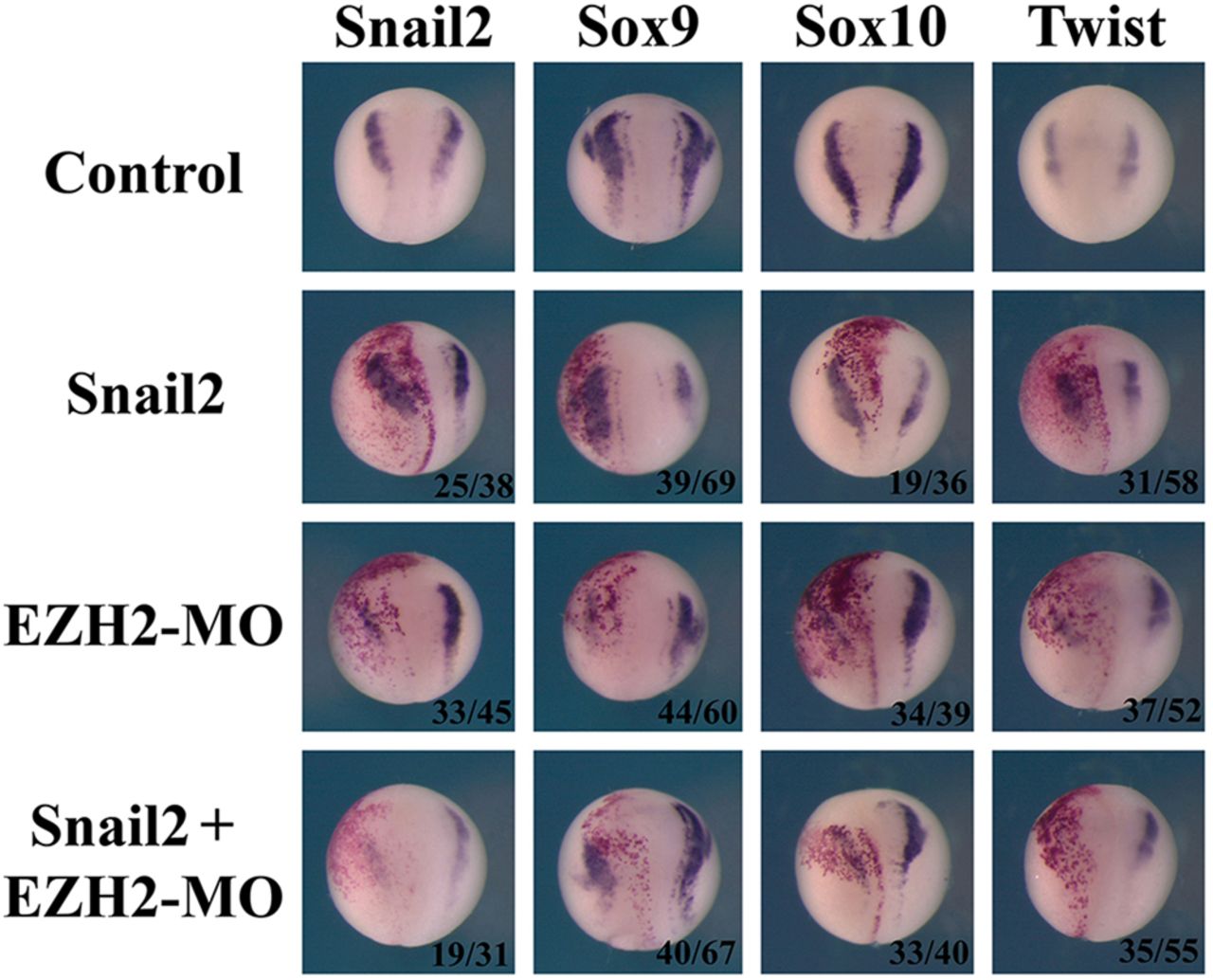 Fig. 4. Snail2 requires EZH2 to regulate neural crest markers. Snail2 RNA (0.15â ng) was injected alone or with 20â ng EZH2-MO unilaterally into two-cell-stage embryos. ISH performed at neurula stages 17-18 revealed that ectopic expression of Snail2 expanded domains of neural crest genes Snail2, Sox9, Sox10 and Twist. However, Snail2 failed to expand the domains of these genes in the presence of EZH2-MO, implying that neural crest expansion by Snail2 required EZH2 function. The numbers of embryos showing the displayed patterns over total embryos analyzed are shown. |