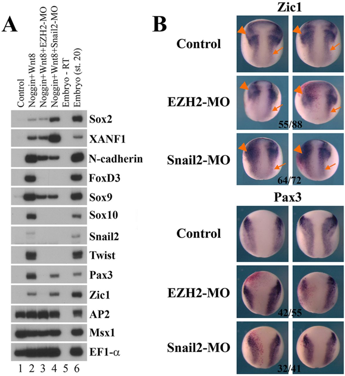 Genes referenced: ap2a1 cad eed ezh2 fn1 itk msx1 myod1 nog nrp1 pax3 snai2 sox10 sox3 sox9 suz12 twist1 wnt8a zic1