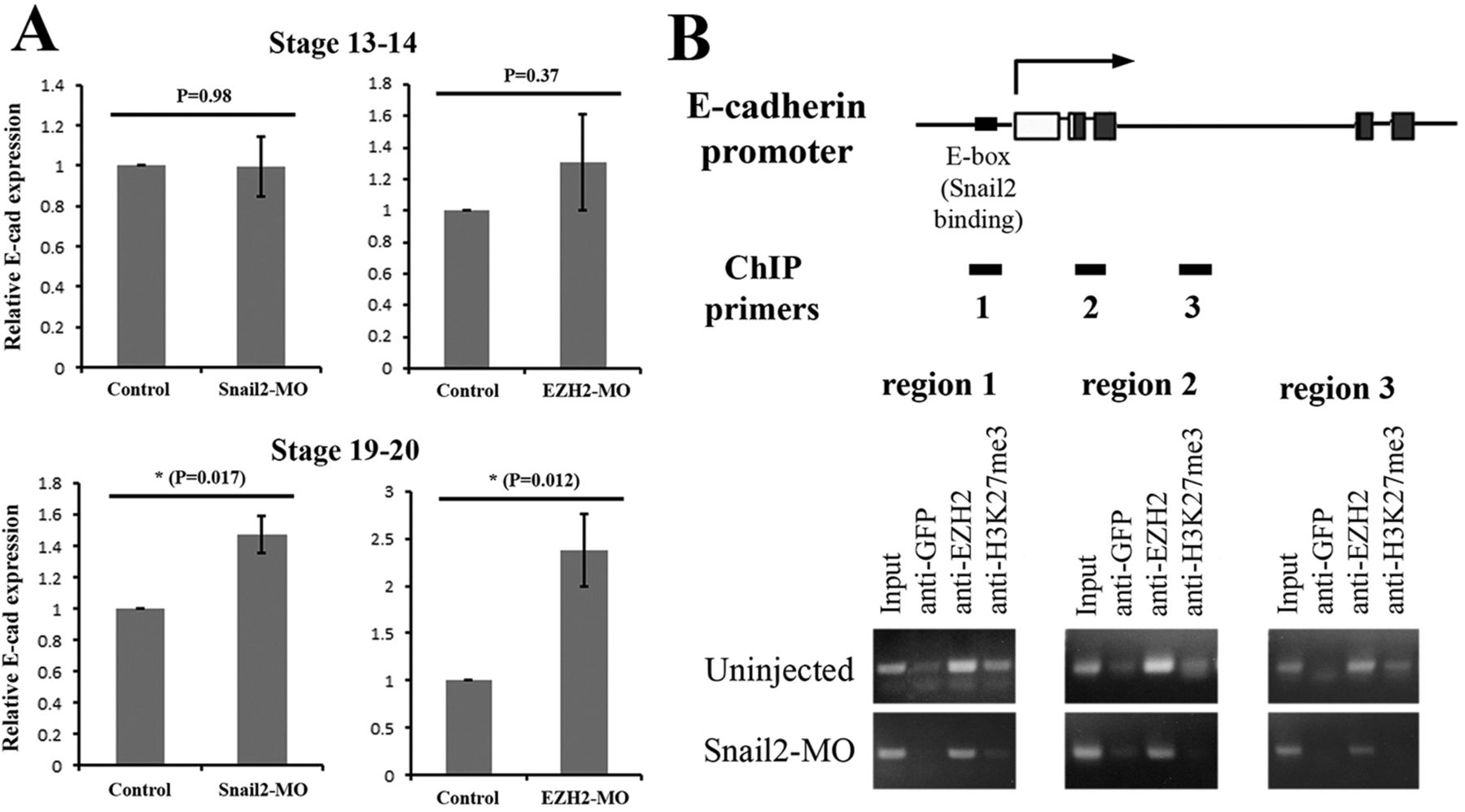 Fig. 8. Snail2 regulates EZH2 occupancy and H3K27me3 levels at the promoter of the Snail2 direct target E-cadherin during neural crest EMT. (A) Knockdown of Snail2 or EZH2 did not appreciably affect E-cad expression at early neurula stages 13-14, but resulted in increased E-cad expression at late neurula stages 19-20, when the neural crest underwent EMT to emigrate from the neural tube. Student's t-test revealed statistically significant changes in E-cad expression in morphant versus control samples at stages 19-20 (P<0.05). (B) Genomic structure around the E-cad promoter and the regions assayed in the ChIP experiments are shown at the top. Snail2-MO (20â ng) was injected into each blastomere of two-cell-stage embryos. Control and injected embryos were harvested at late neurula stages 19-20 for ChIP assay of EZH2 binding and H3K27me3 association with the E-cad promoter. Anti-GFP antibody was used as negative control. Knockdown of Snail2 reduced EZH2 occupancy and decreased H3K27me3 levels at the E-cad promoter, implying that Snail2 recruited EZH2/PRC2 to the E-cad promoter to deposit the repressive chromatin marks during EMT. |
