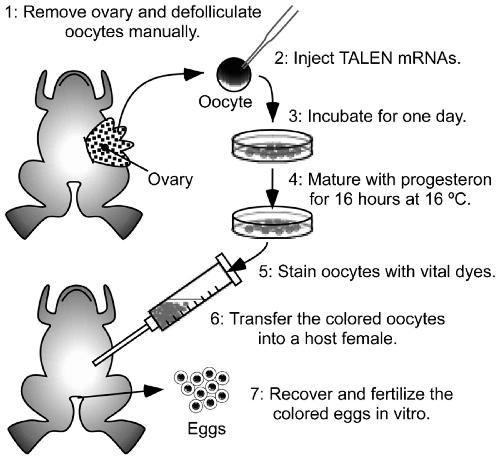 Efficient targeted gene disruption in Xenopus embryos using engineered transcription activator-like effector nucleases (TALENs).