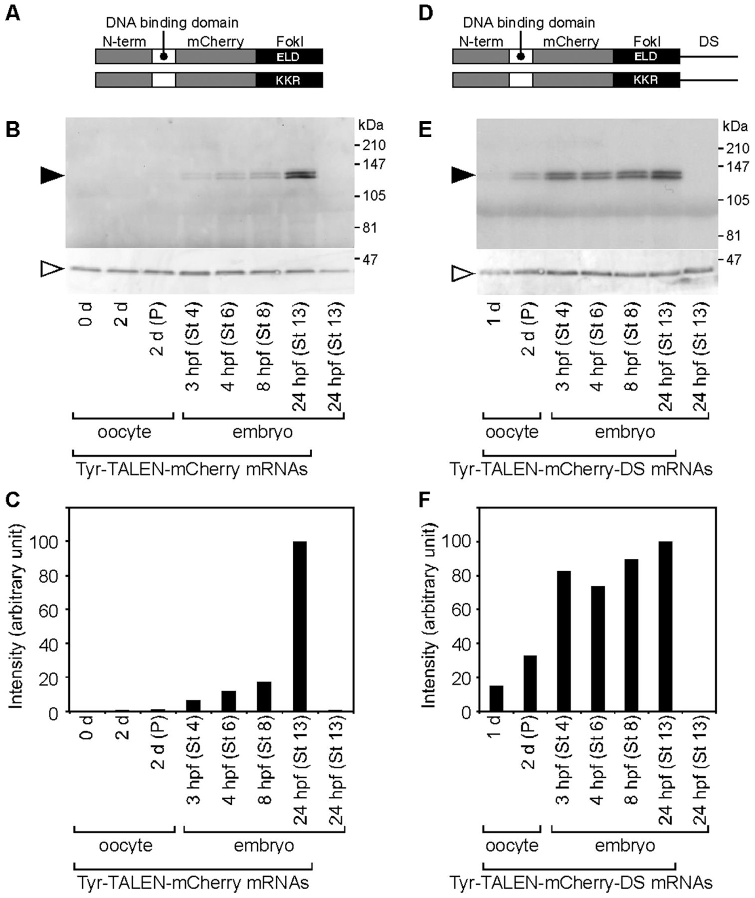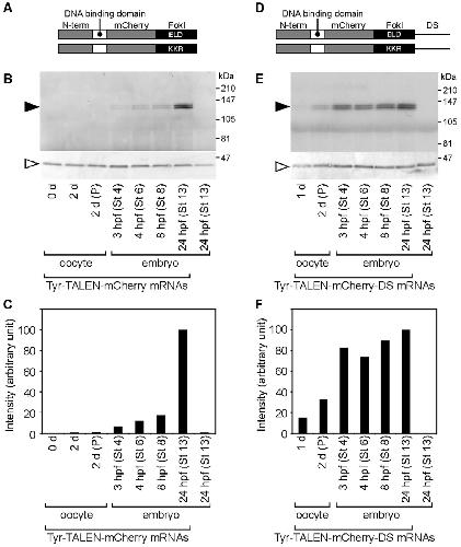 (A,D) Schematic representation of the Tyr-TALEN-mCherry (A) and Tyr-TALEN-mCherry-DS (D) mRNAs. (B,E) Oocytes were injected with either Tyr-TALEN-mCherry (B) or Tyr-TALEN-mCherry-DS (E) mRNAs, transferred into a host female, and fertilized. Five oocytes or host-transferred embryos were homogenized at the indicated time and examined by Western blot analysis using anti-DsRed and anti-actin antibodies. The closed and open arrowheads indicate the positions of the Tyr-TALEN-mCherry and actin proteins, respectively. The stage 13 embryos in the right-most lane were not injected with mRNAs. (C,F) Quantification of the Tyr-TALEN-mCherry protein signals shown in (B,E). The Tyr-TALEN-mCherry proteins were normalized to actin and the signal for the lysates of the stage 13-injected embryos was set to 100%. P, progesterone-treatment.
