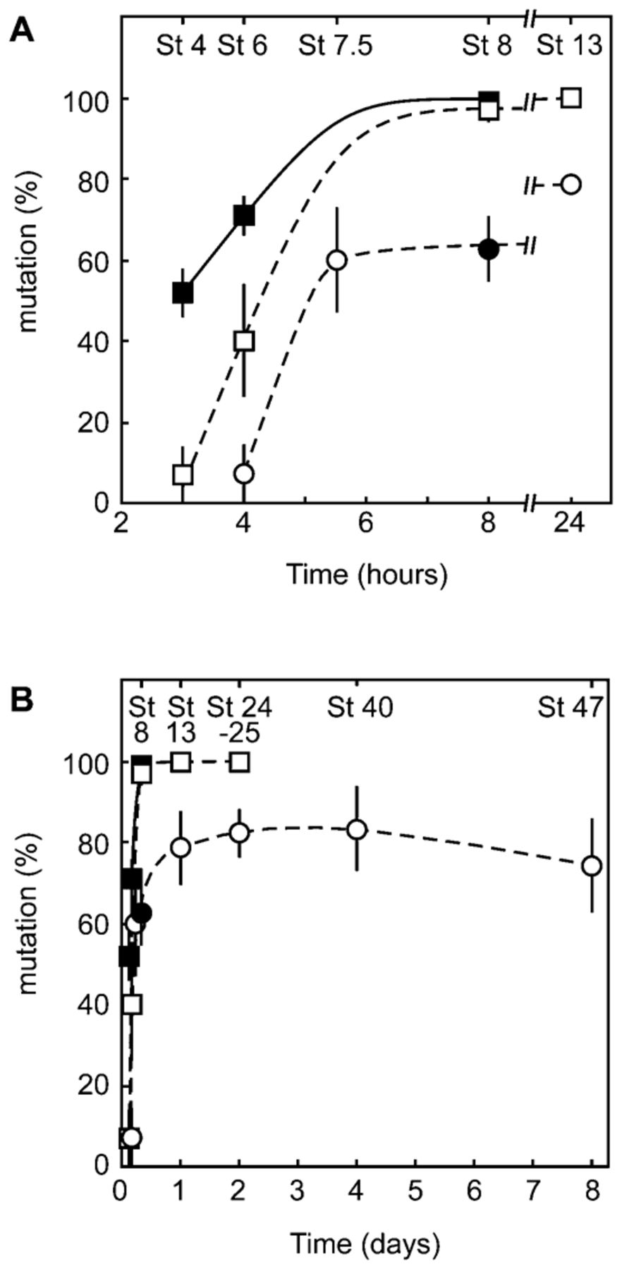 Oocytes (squares) or fertilized eggs (circles) were injected with either Tyr-TALEN (open squares and circles) or Tyr-TALEN-DS (closed squares and a circle) mRNAs. The injected oocytes were treated with progesterone, transferred into a host female, and fertilized. The genomic DNA was extracted from four to six individual embryos at the indicated times. The target DNA was amplified by PCR and cloned. The DNA sequence was determined for five to fifteen clones per embryo (supplementary material Figs S1, S2). The data are expressed as the mean value ± standard error. The abscissa is indicated by hours (A) and days (B).