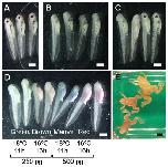(A) Wild-type stage 39â40 tadpoles. (B,C) Fertilized eggs were injected with 500â pg of Tyr-TALEN mRNAs. Four of the stage 39â40 tadpoles were derived from the eggs from two different female frogs (B) and (C). (D) Oocytes were injected with Tyr-TALEN mRNAs, transferred into a host female, and fertilized. Each pair of stage 39â40 tadpoles is colored green, brown, mauve, or red from left to right. The green- and brown-colored tadpoles were derived from oocytes injected with 250â pg of mRNA. The mauve- and red-colored tadpoles were derived from oocytes injected with 500â pg of mRNA. The oocytes were matured by progesterone at 18°C for 11â hours for the green- and mauve-colored tadpoles. The oocytes were matured by progesterone at 16°C for 16â hours for the brown- and red-colored tadpoles. There was no difference between oocytes treated with progesterone at 18°C for 11â hours and those treated at 16°C for 16â hours. Tadpoles were selected randomly. (E) An image of the frogs derived from the oocytes that were injected with Tyr-TALEN mRNAs. Five of seven frogs showed perfect albino phenotypes. Scale barsâ=â1â mm (AâD) or 1â cm (E).