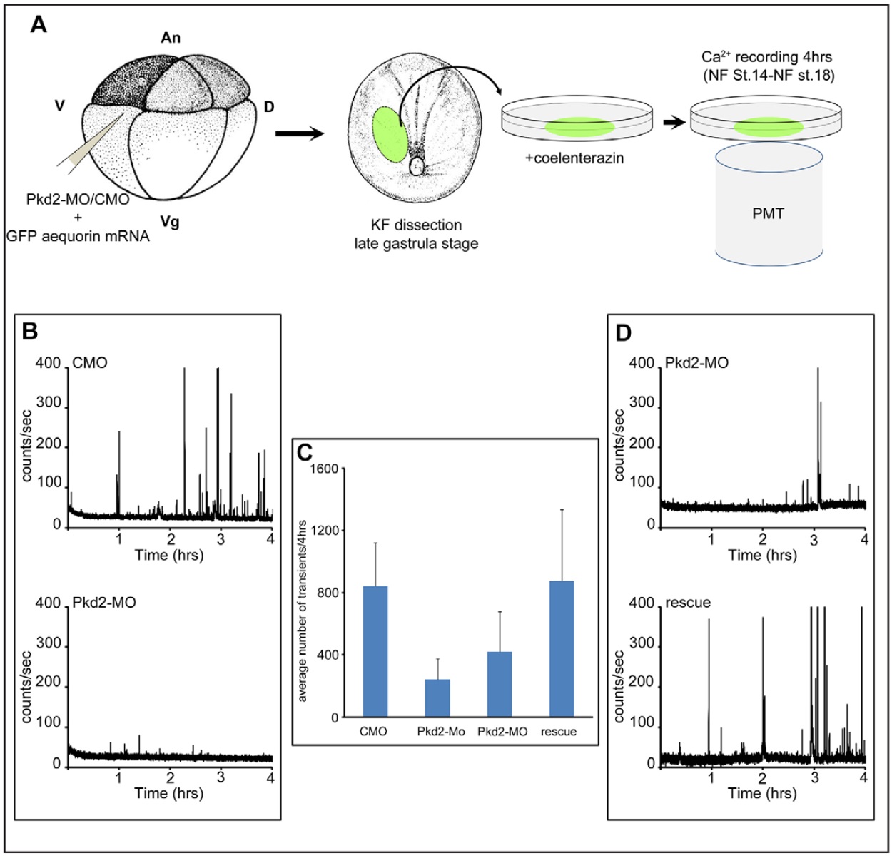 CMO or Pkd2-MO morpholinos were injected in the V2 blastomere of eight-cell stage embryos along with GFP–aequorin mRNA. Kidney field (KF) explants were